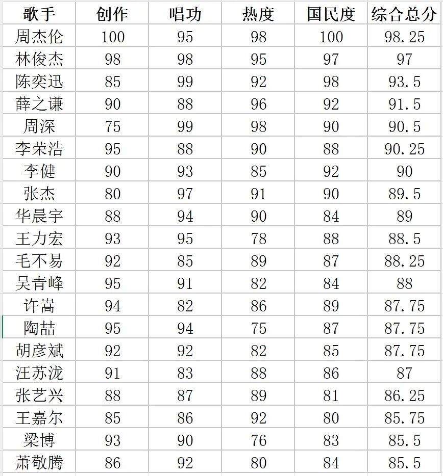 周杰伦以98.25的综合评分稳居榜首,其创作能力(100分)与大众认知度(100分)双双斩获满分,充分彰显他作为跨世代文化图腾的稳固地位。