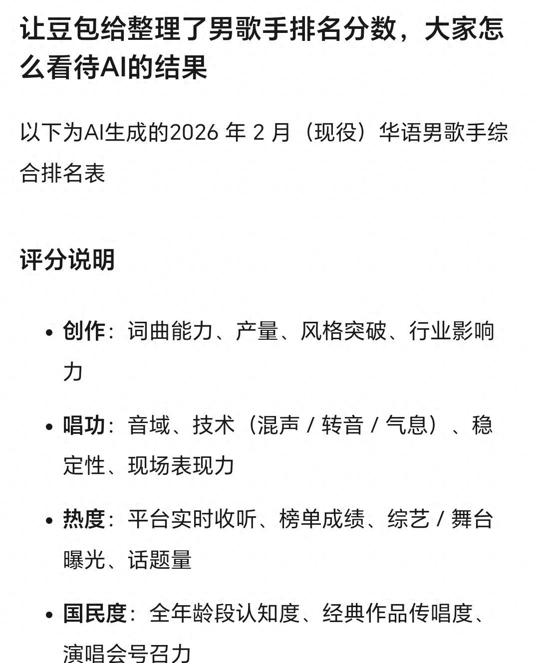此次引发热议的,是某位网友委托豆包对华语流行音乐领域展开系统性评估所生成的歌手综合实力榜单。大家尽可轻松浏览、一笑而过——至于是否完全贴合现实,暂无权威背书;不过相较普通网友的主观判断,AI模型的分析维度显然更具结构化与数据支撑。